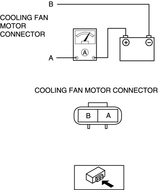 2. Install a tester and battery to the cooling fan motor connector (2 terminals) as shown in the figure.