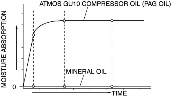 - ATMOS GU10 compressor oil (PAG oil) has a higher moisture absorption efficiency than the previously used mineral oil. If moisture mixes with the compressor oil, the refrigerant system could be damaged. Therefore, install caps immediately after using the compressor oil or removing refrigerant system parts to prevent moisture absorption.