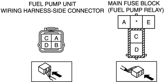 - Fuel pump unit terminal B and fuel pump relay terminal C