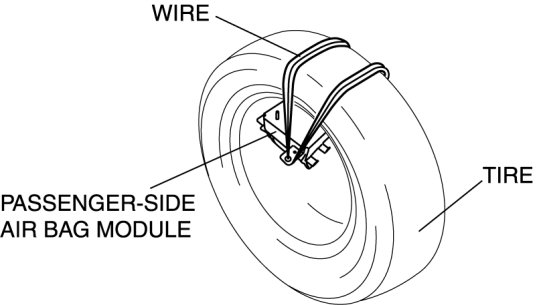 3. Place the padded surface of the passenger-side air bag module facing the center of the tire as shown in the figure. To secure the air bag module to the tire wheel, wrap a wire (cross section 1.25 mm2 {0.002 in2} or more) through the tire and the brackets at least 4 times as shown in the figure.