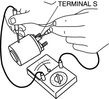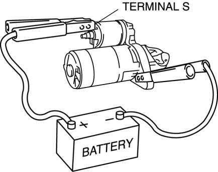 1. Verify that the starter motor pinion is protracted while battery positive voltage is connected to terminal S and the starter body is grounded.