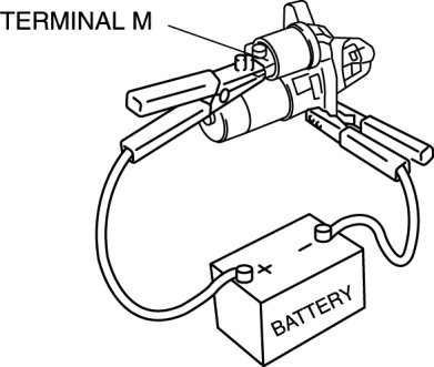 2. Connect battery positive voltage to terminal M and ground the starter body.