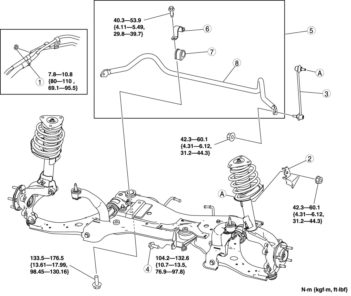 2. Lower the front crossmember slowly approx. 90 mm {3.5 in} and remove the front stabilizer component.