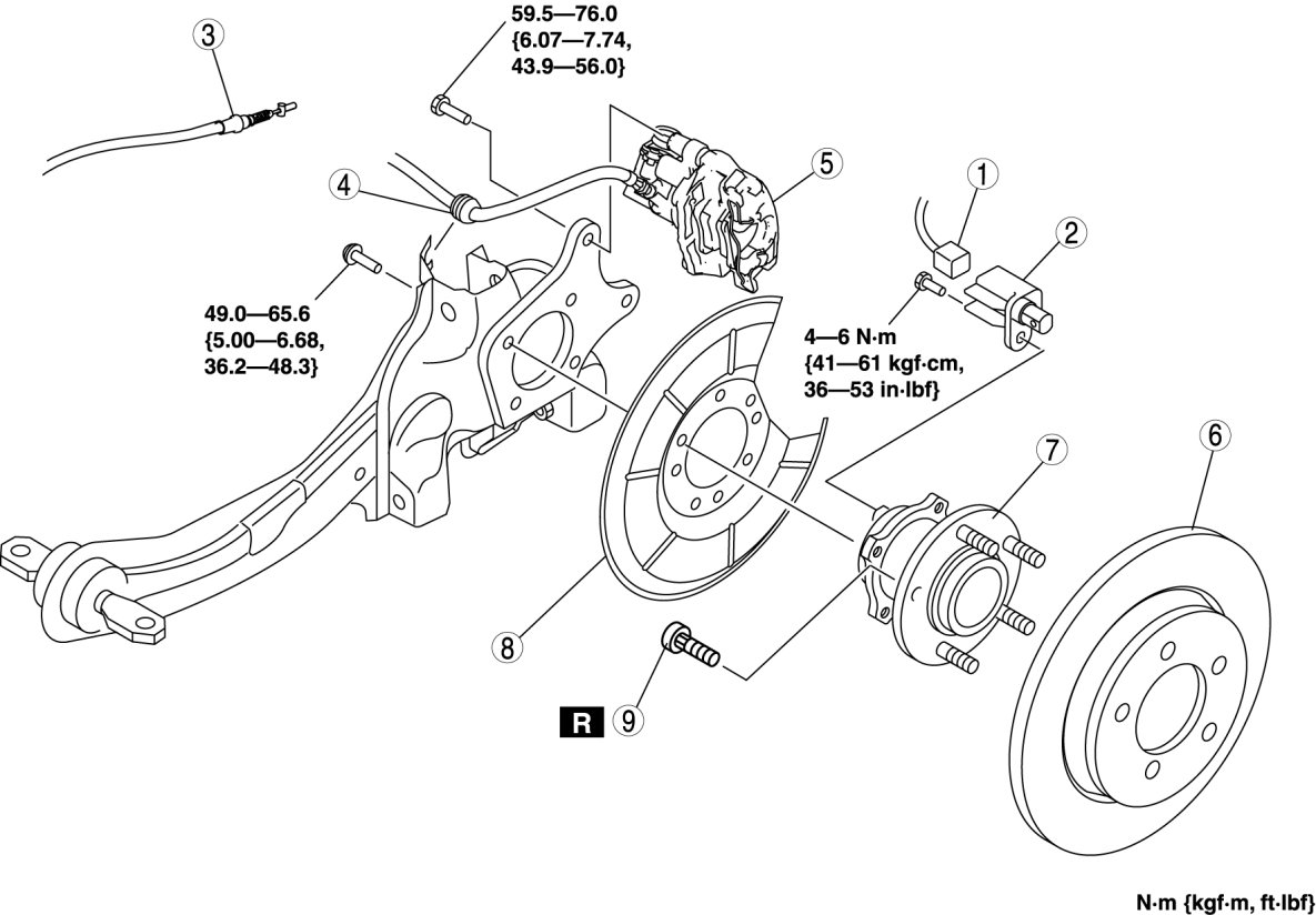 - Performing the following procedures without first removing the ABS wheel-speed sensor may possibly cause an open circuit in the wiring harness if it is pulled by mistake. Before performing the following procedures, disconnect the ABS wheel-speed sensor connector (body side) and fix the wiring harness to an appropriate place where it will not be pulled by mistake while servicing the vehicle.