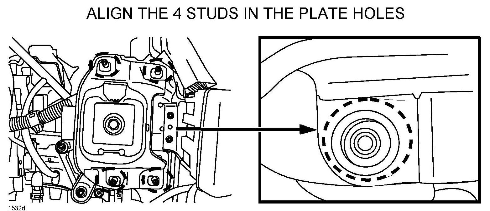 12. With top plate of No.4 engine mount removed, move engine mount bottom plate or engine until all four (4) installation studs on the vehicle align with the engine mount holes.