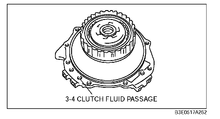 3) Apply compressed air to the part indicated in the figure and let the 3-4 clutch piston stroke three times.