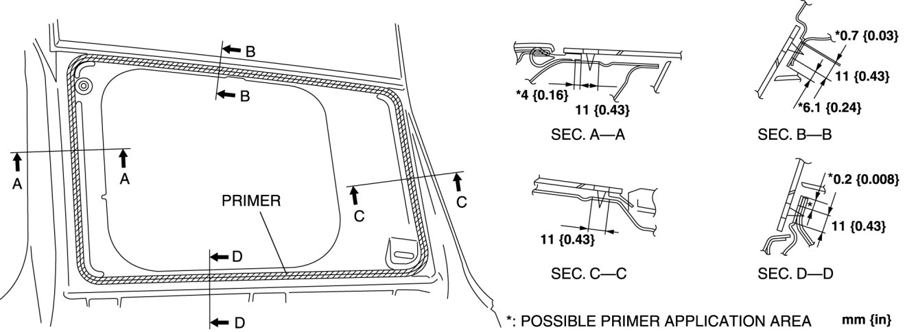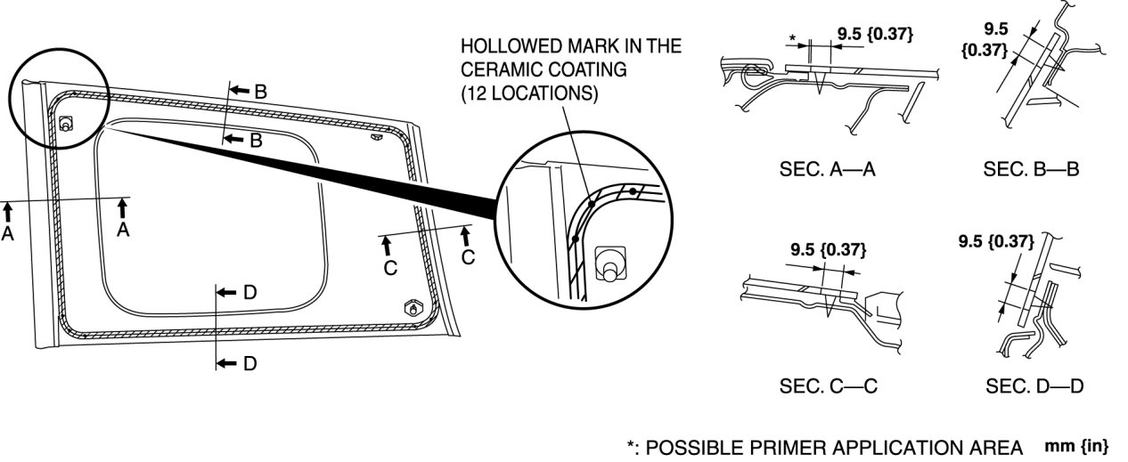 5. Apply glass primer along the hollowed marks in the ceramic coating on the new glass, along the sealant tracks on the reused glass, then allow it to dry for approx. 30 min.