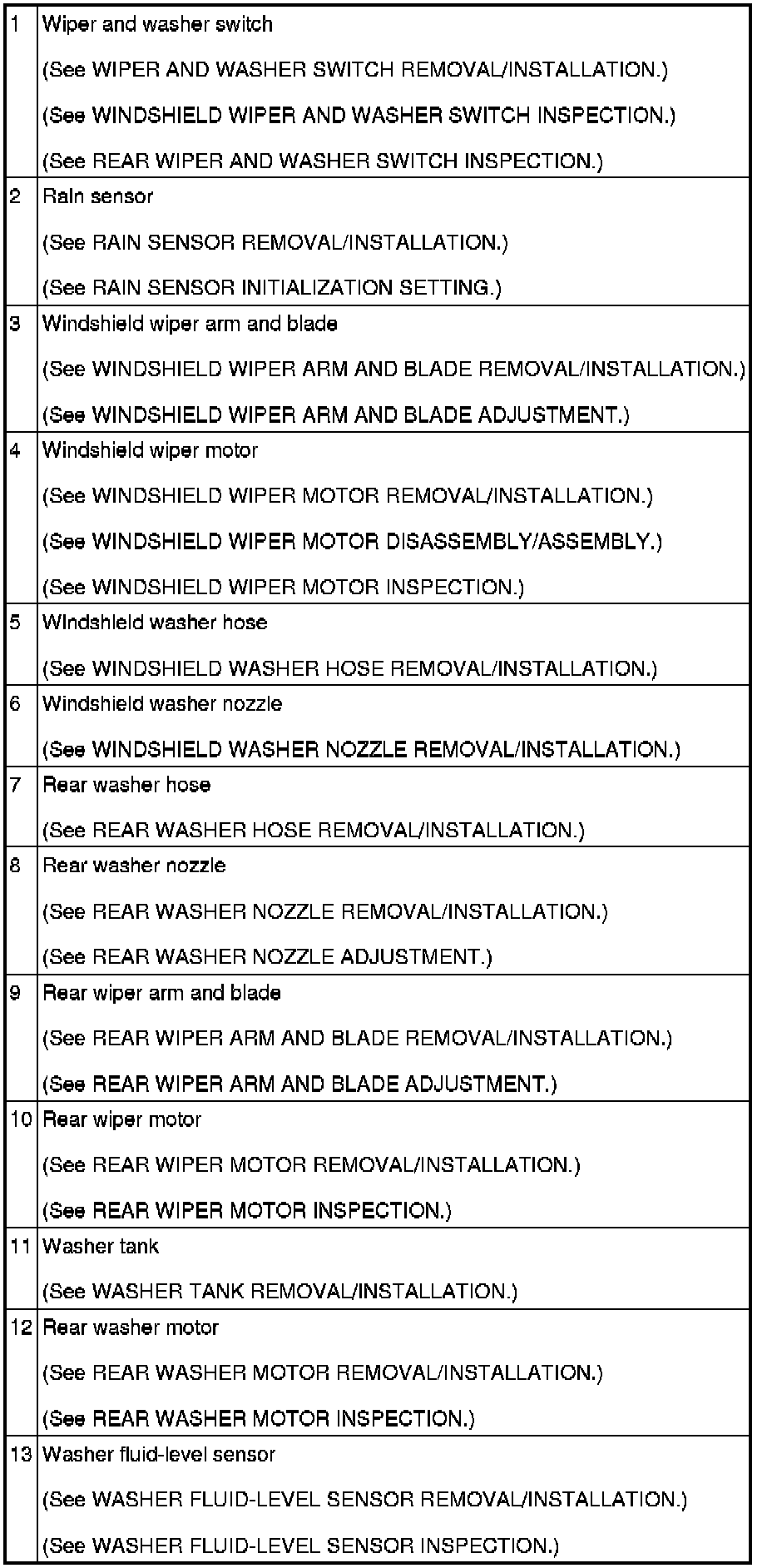 WIPER/WASHER SYSTEM LOCATION INDEX