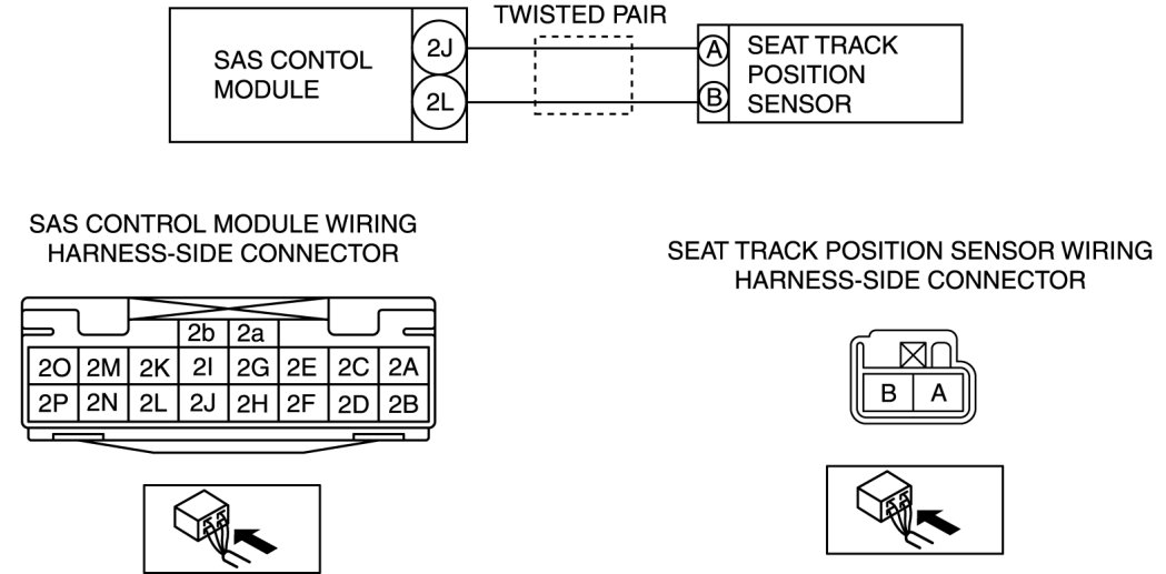 - Open or short circuit or short to ground or short to power supply in wiring harness between seat track position sensor and SAS control module.