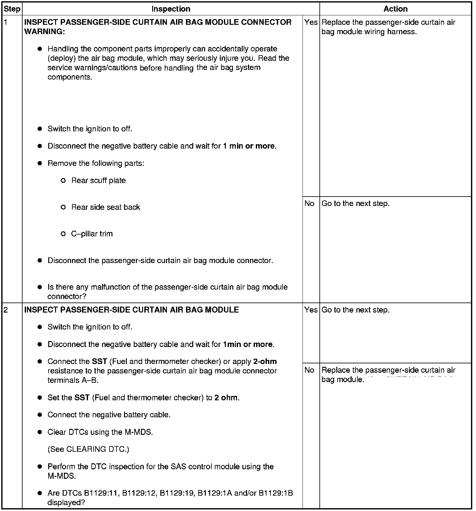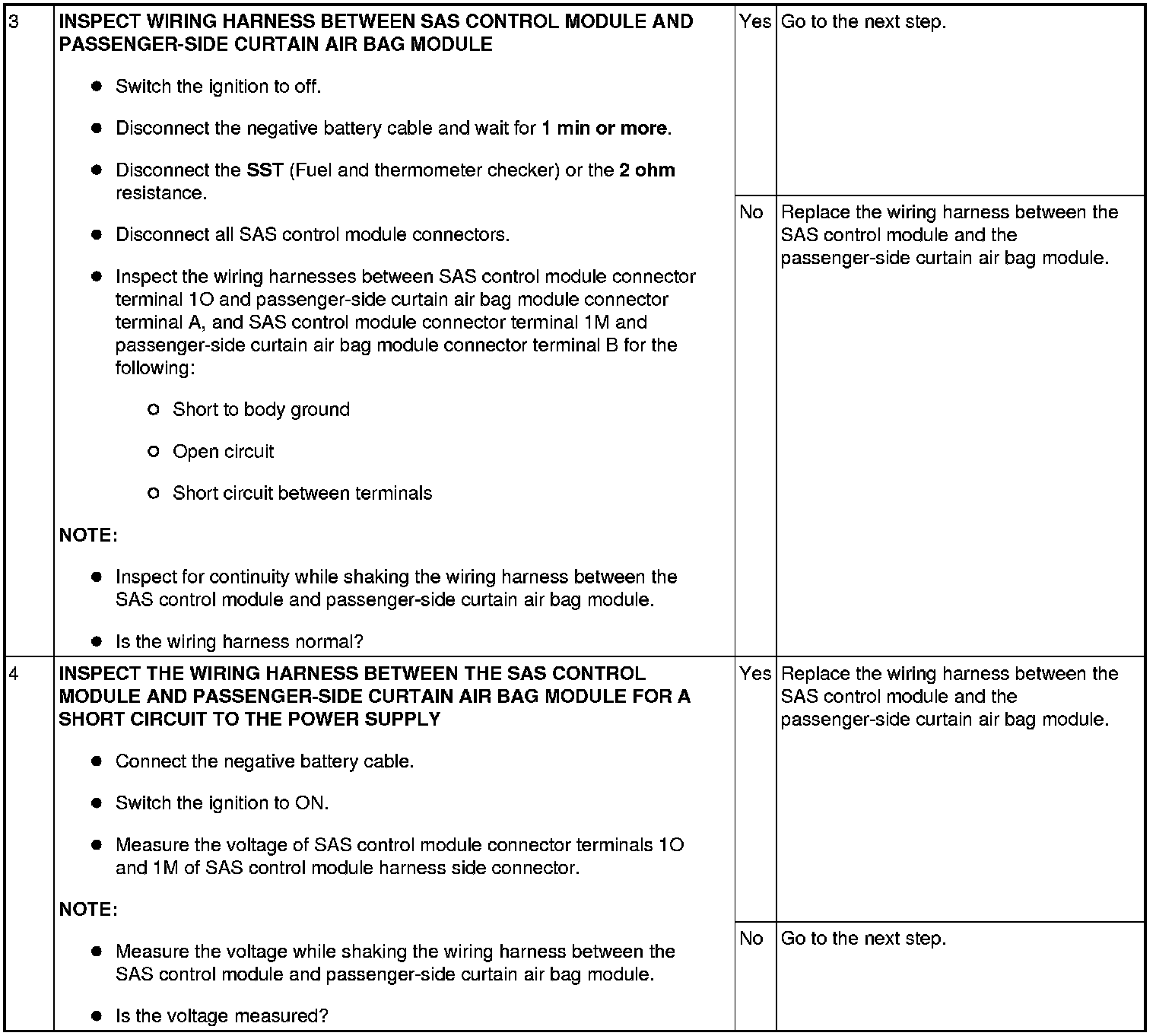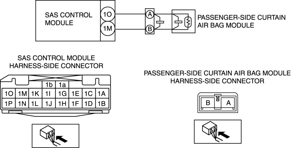 - Open or short circuit or short to ground or short to power supply in the wiring harness between the passenger-side curtain air bag module and SAS control module