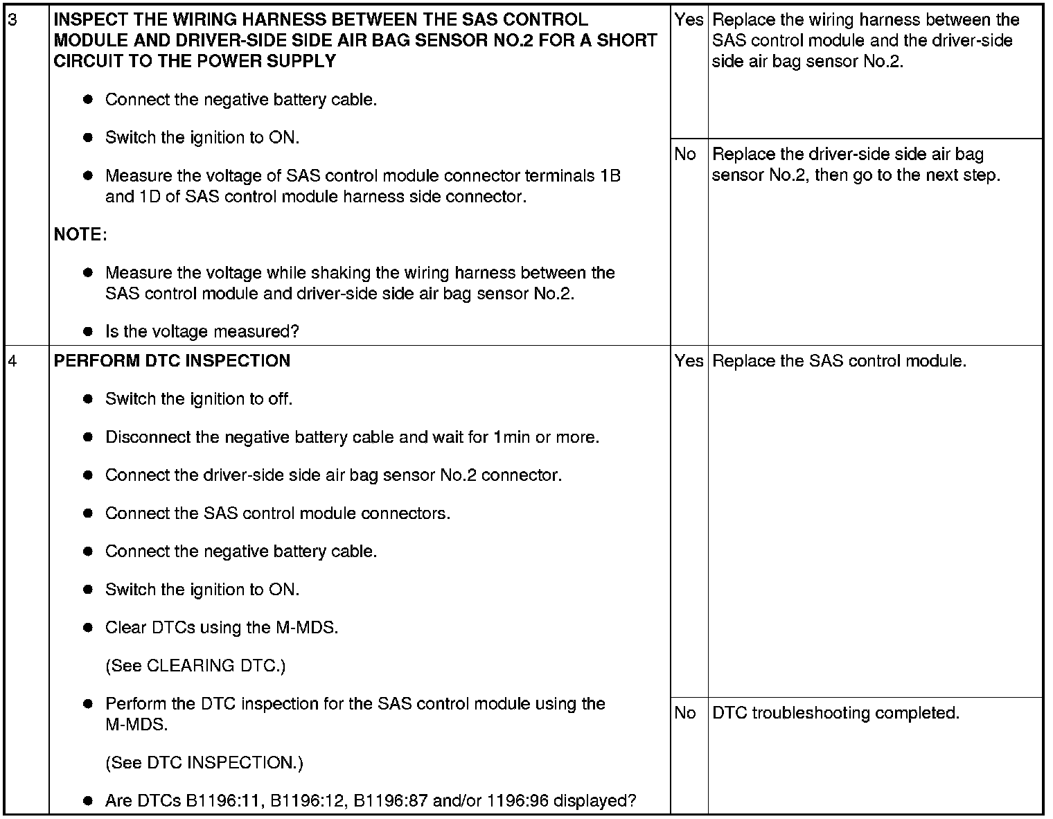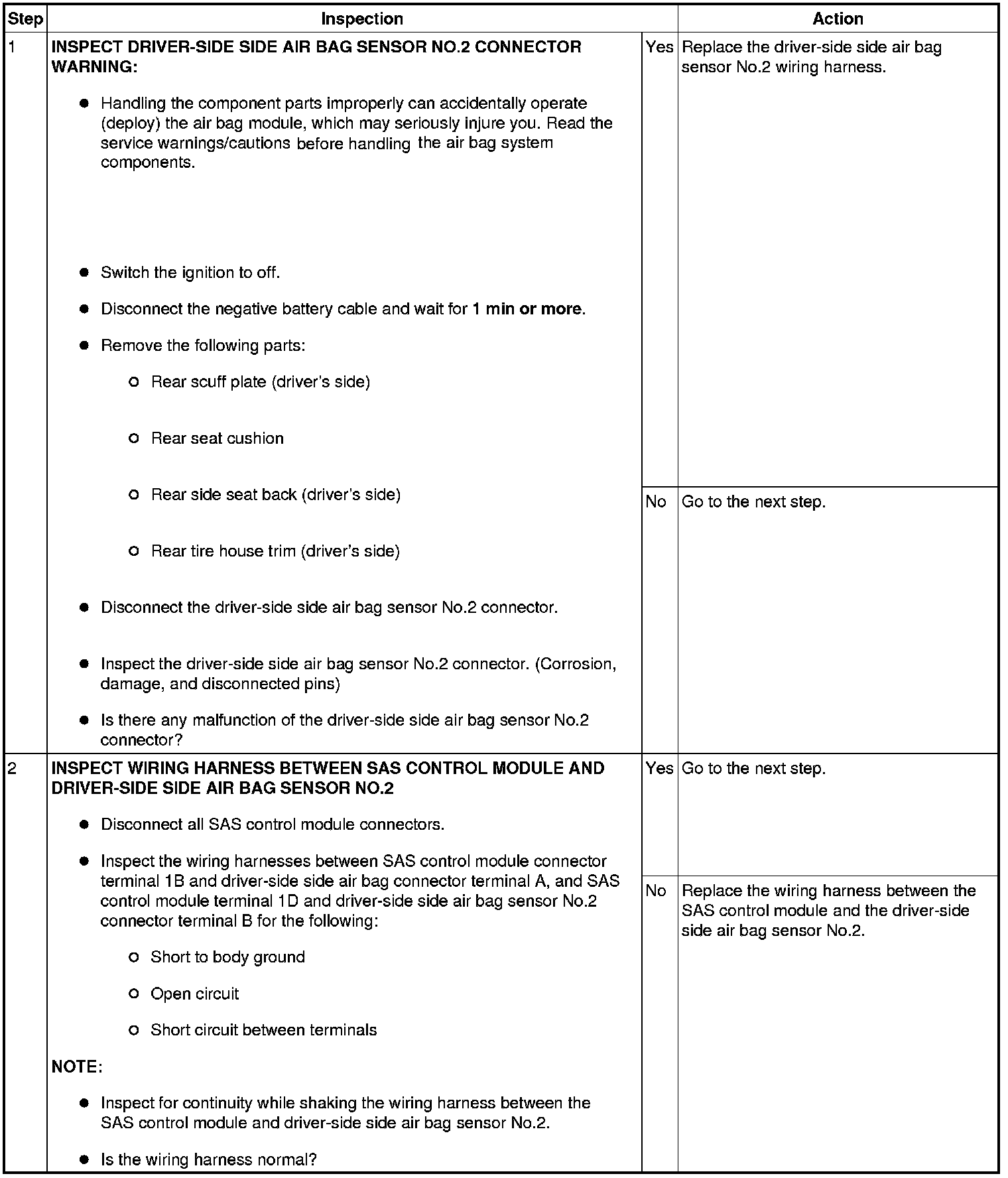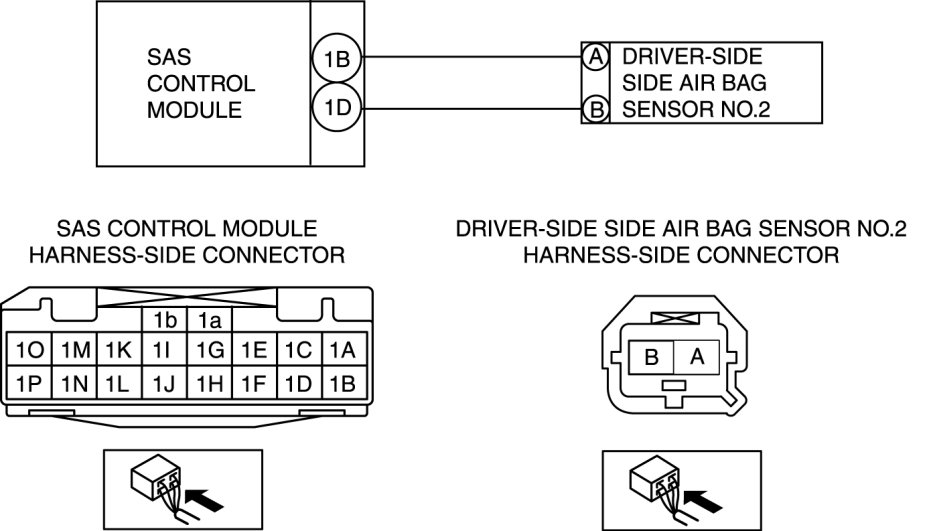 - Open or short circuit or short to ground or short to power supply in the wiring harness between the driver-side side air bag sensor No.2 and SAS control module