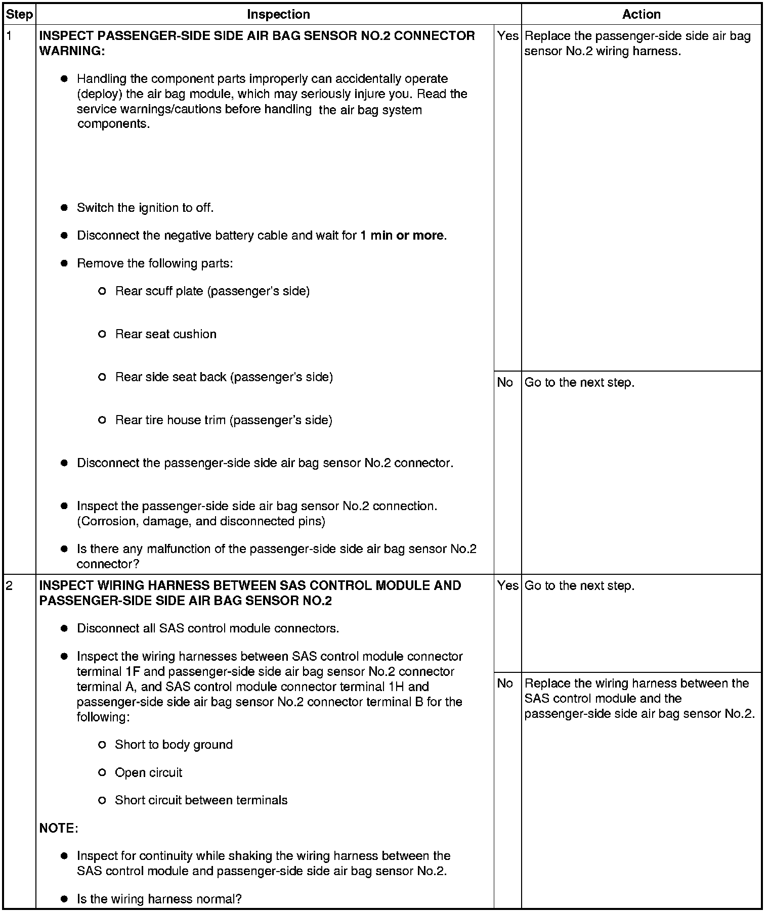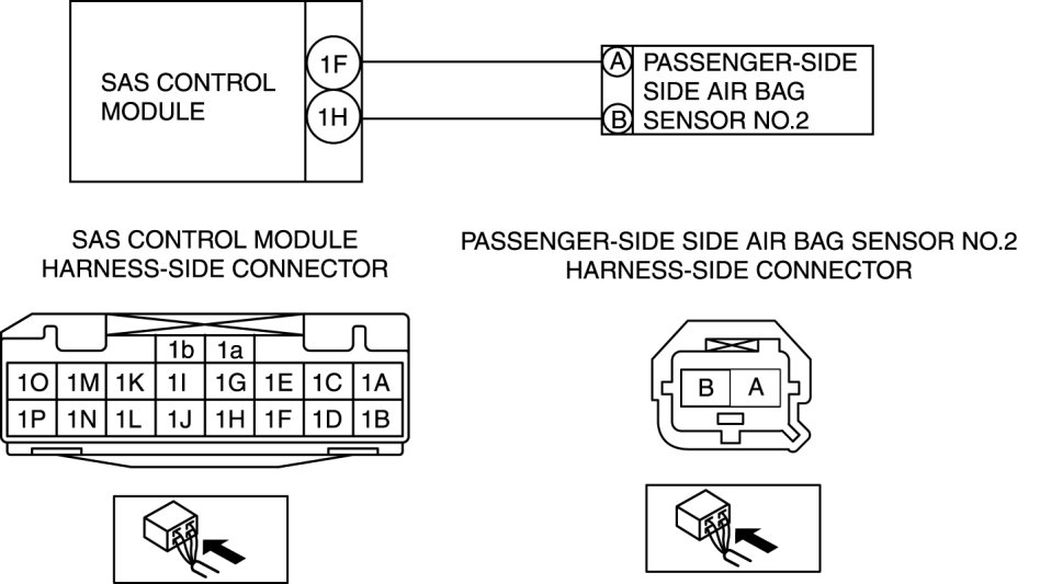 - Wiring harness between passenger-side side air bag sensor No.2 and SAS control module has a malfunction.