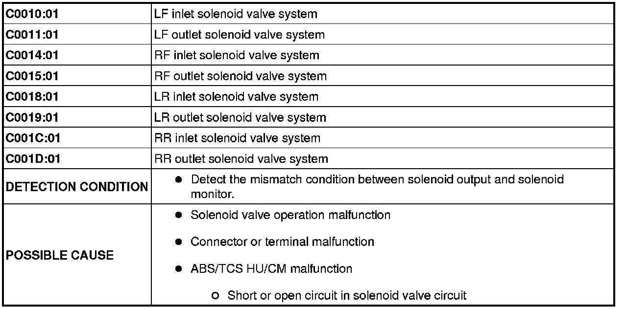 DTC C0010:01/C0011:01/C0014:01/C0015:01/C0018:01/C0019:01/C001C:01/C001D:01 [ABS/TCS]