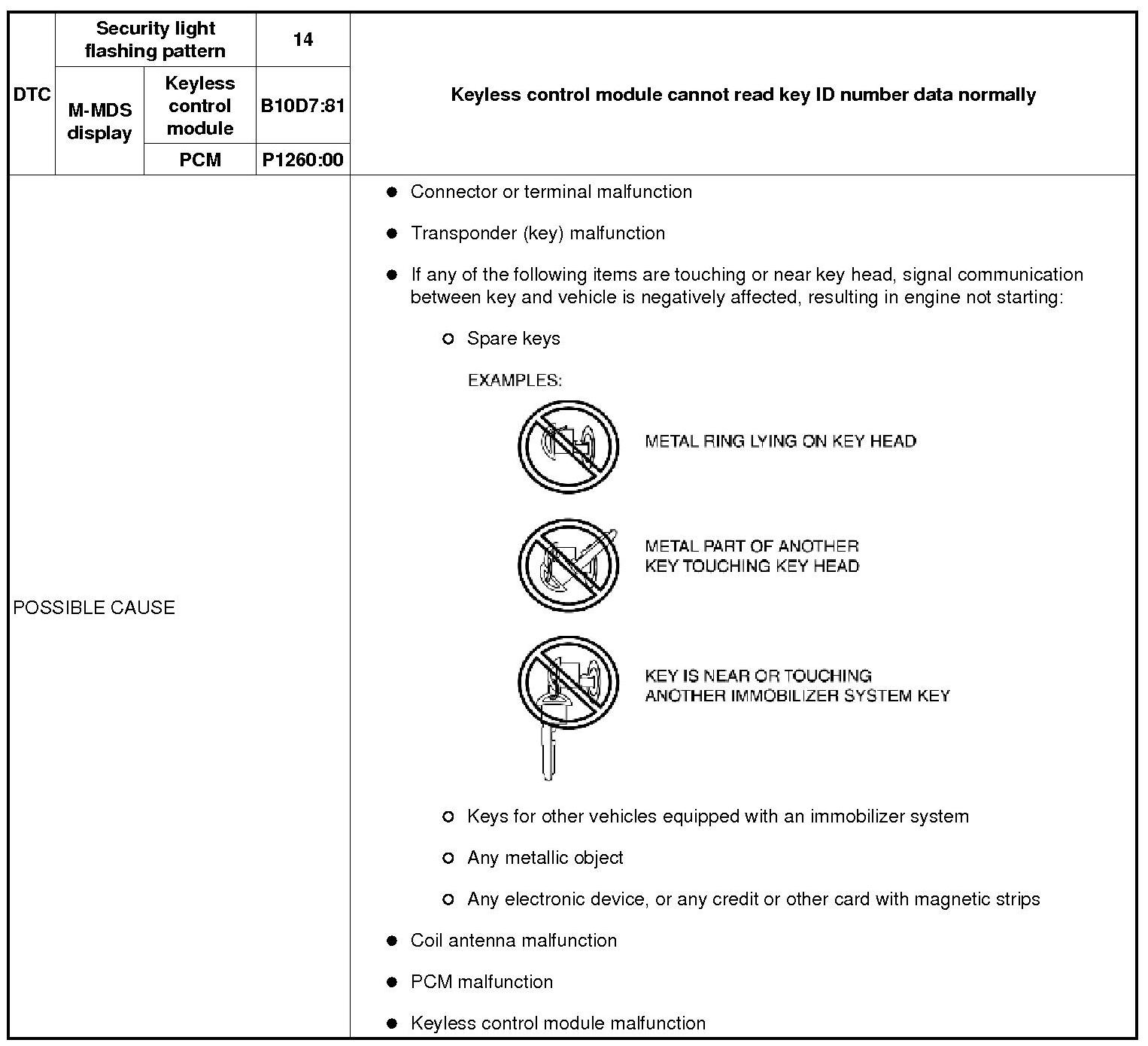 SECURITY LIGHT: 14, DTC: B10D7:81/P1260:00 [IMMOBILIZER SYSTEM (ADVANCED KEYLESS ENTRY AND PUSH BUTTON START SYSTEM)]