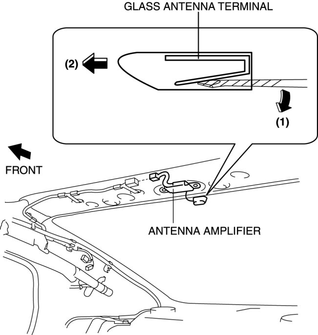 1. Remove the connector B in the direction of the arrow (2) shown in the figure while pressing the glass antenna terminal in the direction of the arrow (1).
