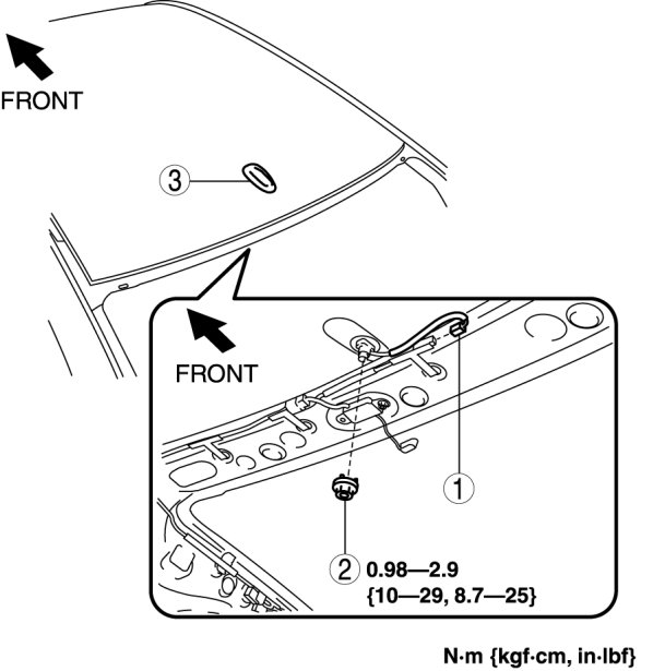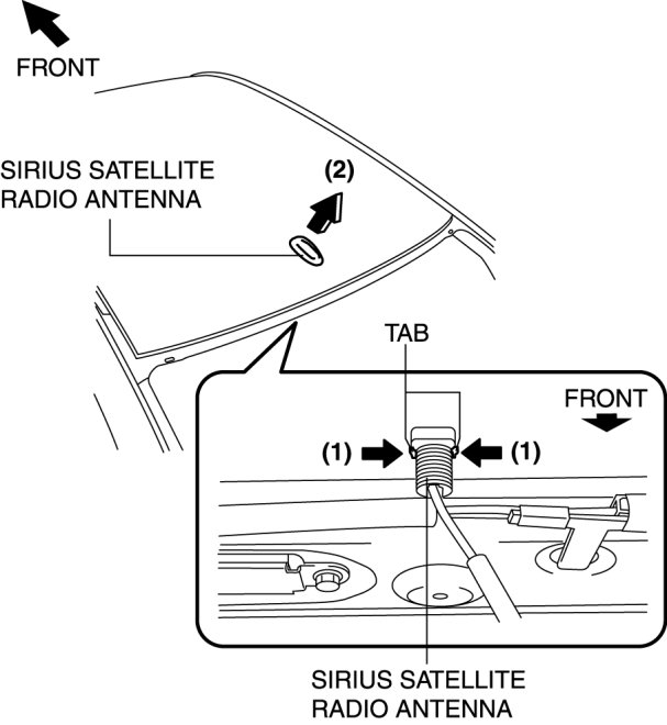 1. Remove the SIRIUS satellite radio antenna in the direction of the arrow (2) shown in the figure while pressing the SIRIUS satellite radio antenna tabs in the direction of the arrow (1).