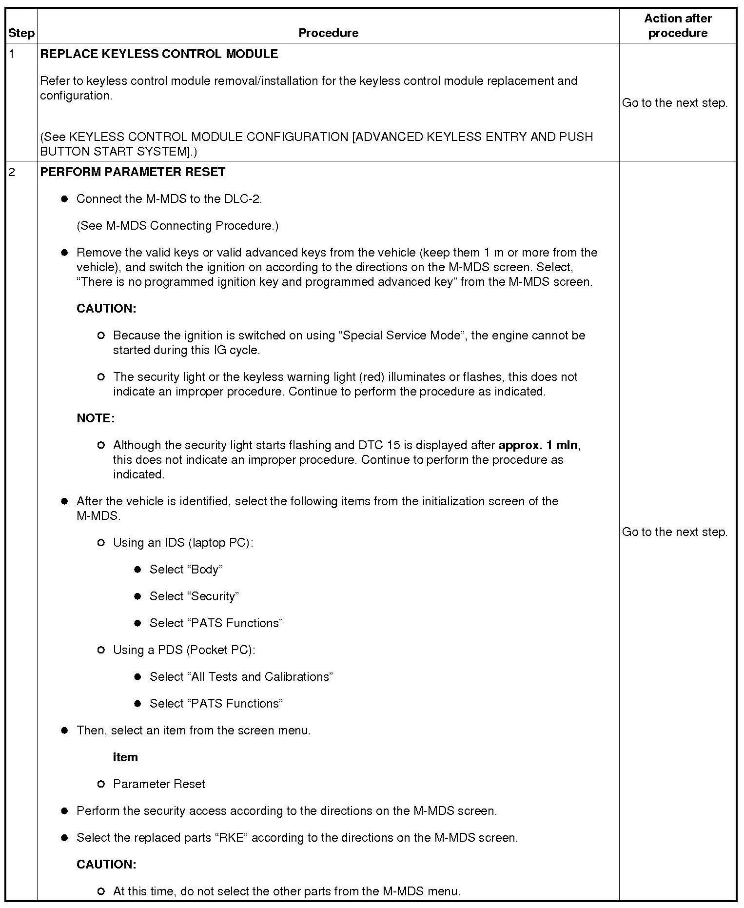 - When replacing the keyless control module or the steering lock, remove the valid keys or valid advanced keys from the vehicle (keep them 1 m or more from the vehicle) and switch the ignition on according to the directions on the M-MDS screen. Select, "There is no programmed ignition key and programmed advanced key" from the M-MDS screen.
