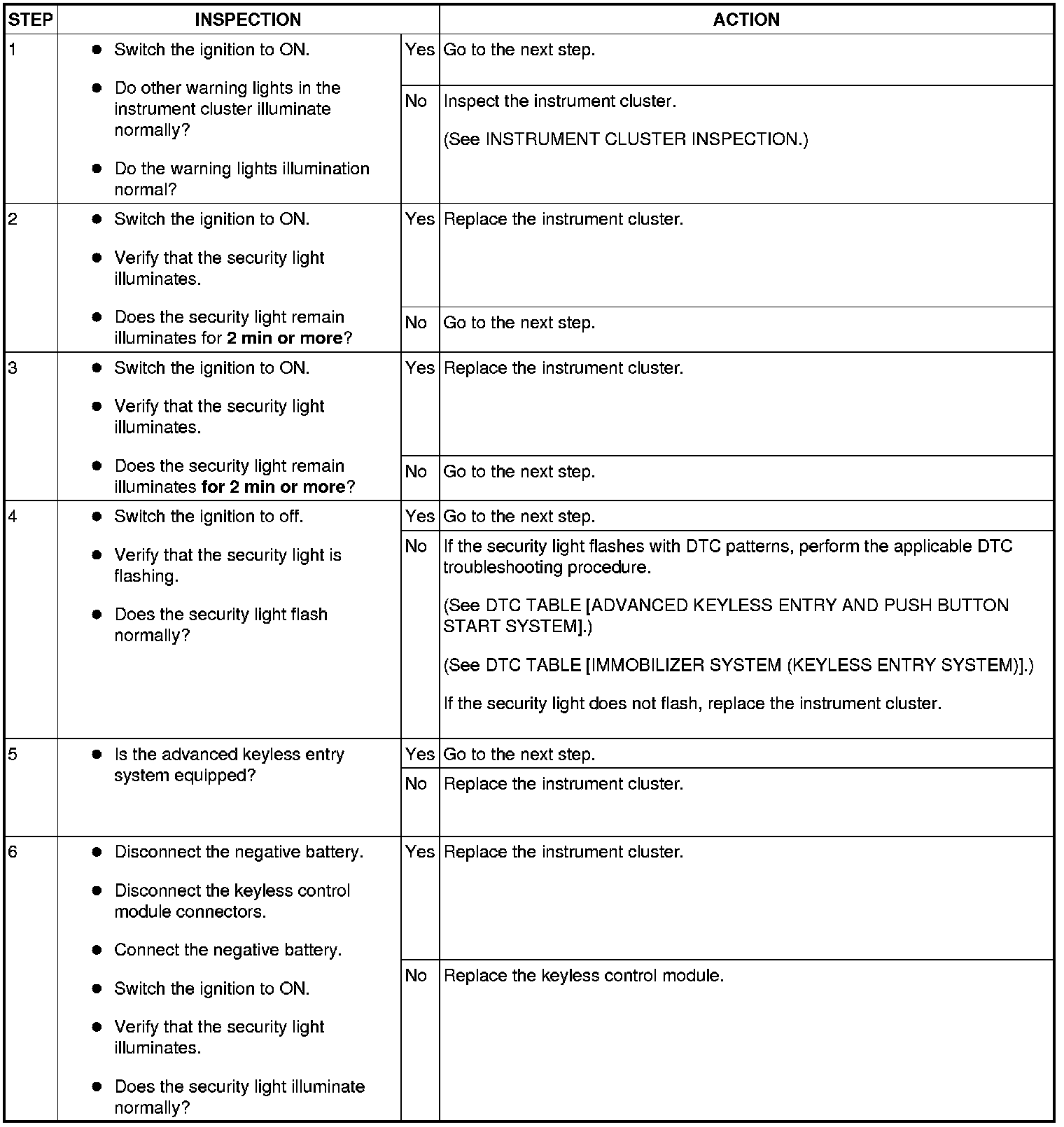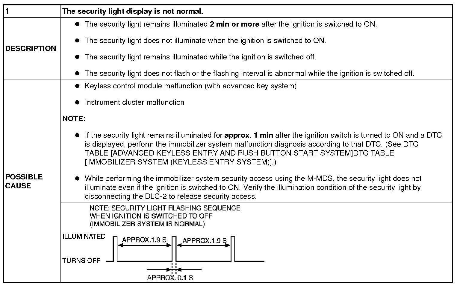- Normal operation of the security light is as follows. The light starts flashing every 2 s when the ignition switch is turned from ON to ACC position and the immobilizer system is armed. The light stops flashing when the ignition switch is turned to the ON position with the correct ignition key. At this time, the immobilizer system is disarmed and the security light illuminates for about 3 s and then goes out.