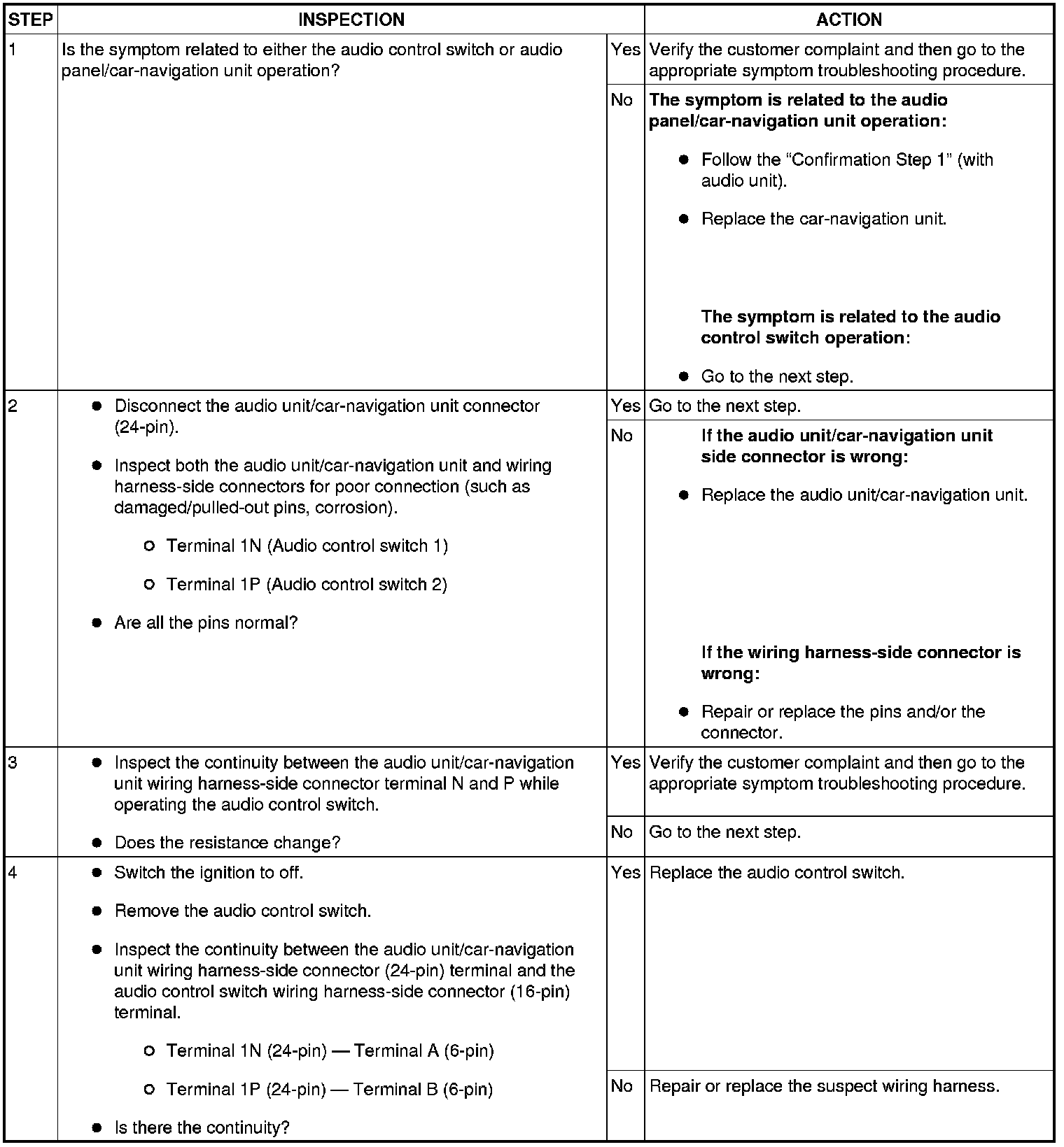 - Verify the customer complaint and identify either the audio control switch malfunction or audio unit/car-navigation unit malfunction.