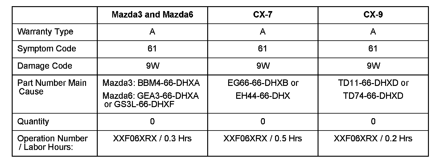 ^ This repair will be covered under Mazda's New Vehicle Limited Warranty term. Additional diagnostic time cannot be claimed for this repair.