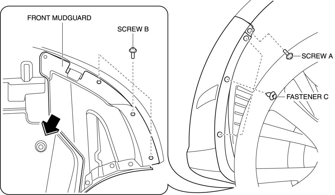 2. Remove screws A, B and fasteners C and set the front mudguard out of the way in the direction of the arrow shown in the figure.