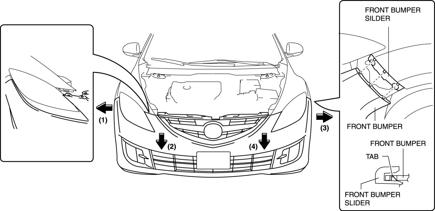 5. Pull the front bumper in the direction of the arrow in the order of (1), (2), (3) and (4), then remove the front bumper.