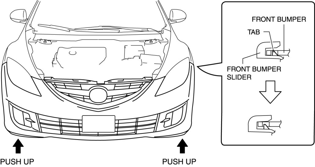 - The front bumper and front bumper slider are engaged firmly. If they are disengaged forcibly the bumper could fall and be damaged. Perform the servicing carefully when disengaging the front bumper from the front bumper slider.