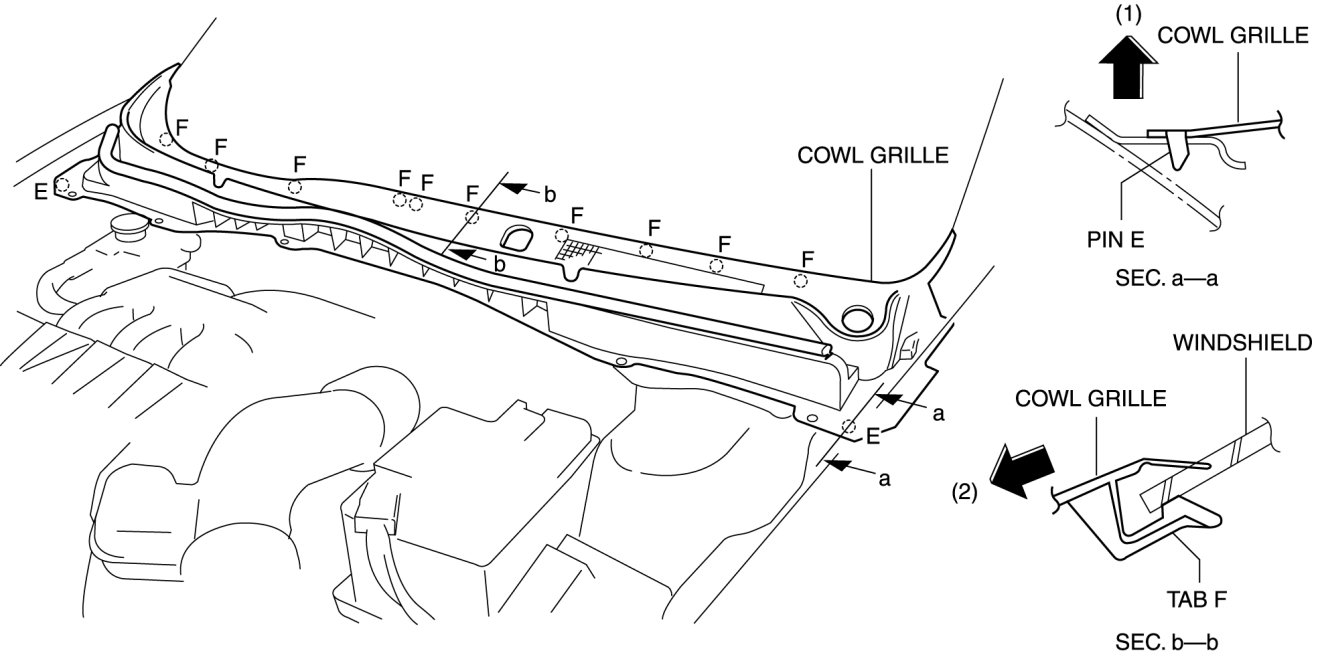 6. Pull the cowl grille in the direction of arrow (1) so that it is free from the pins E, pull tabs F in the direction of arrow (2).