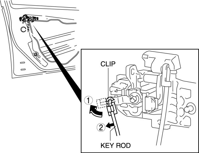 6. Lift the clip in the direction of the arrow (1), and pull out the key rod in the direction of the arrow (2).