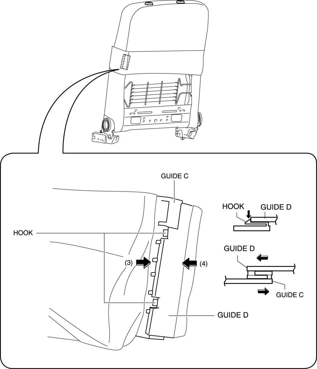 9. Set the front seat back trim aside, press the guide C hooks, and disconnect guide D.