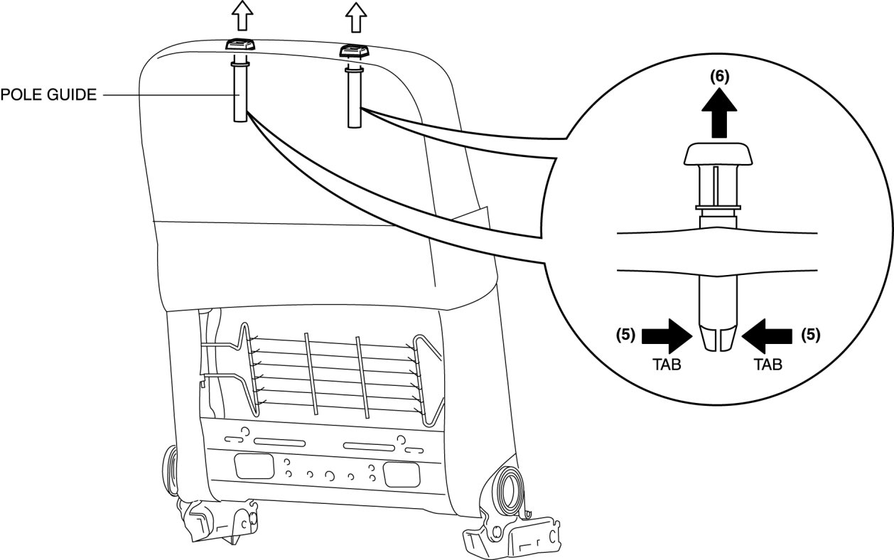 11. Partially peal back the front seat back trim, release the pole guide tabs in the direction of arrow (5) shown in the figure, then pull the pole guide out in the direction of arrow (6).