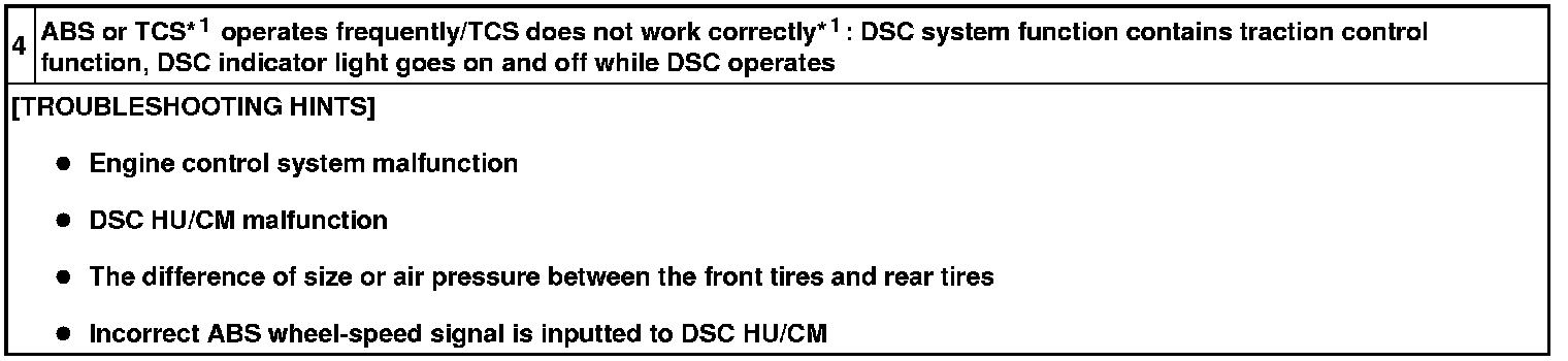 NO.4 ABS OR TCS*1 OPERATES FREQUENTLY/TCS DOES NOT WORK CORRECTLY *1: DSC SYSTEM FUNCTION CONTAINS TRACTION CONTROL FUNCTION, DSC INDICATOR LIGHT GOES ON AND OFF WHILE DSC OPERATES [DYNAMIC STABILITY CONTROL (DSC)]