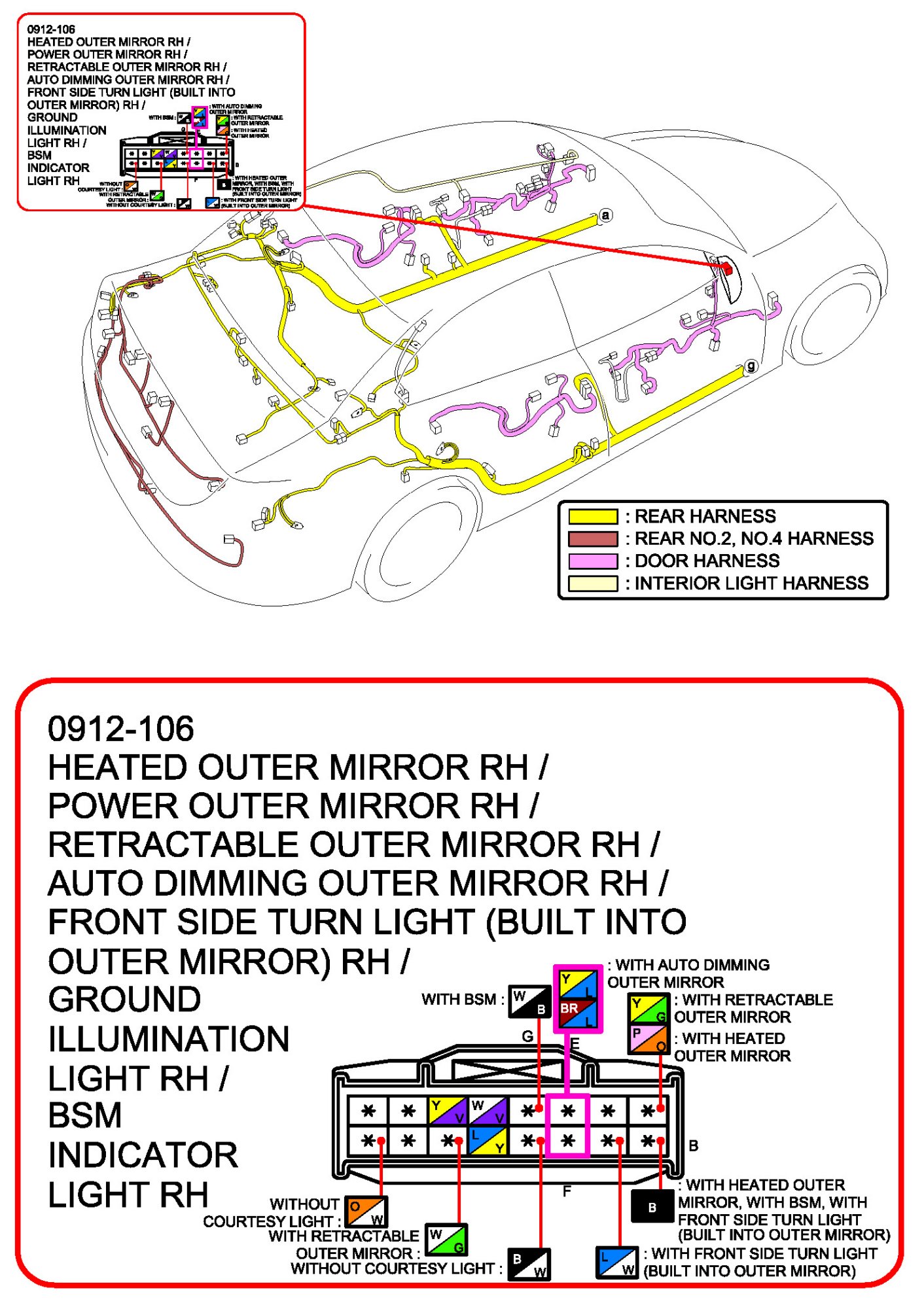 Heated Outer Mirror RH/Power Outer Mirror RH/Retractable Outer Mirror RH/Auto Dimming Outer Mirror RH/Front Side Turn Light (Built Into Outer Mirror) RH/Ground Illumination Light RH/BSM Indicator Light RH: