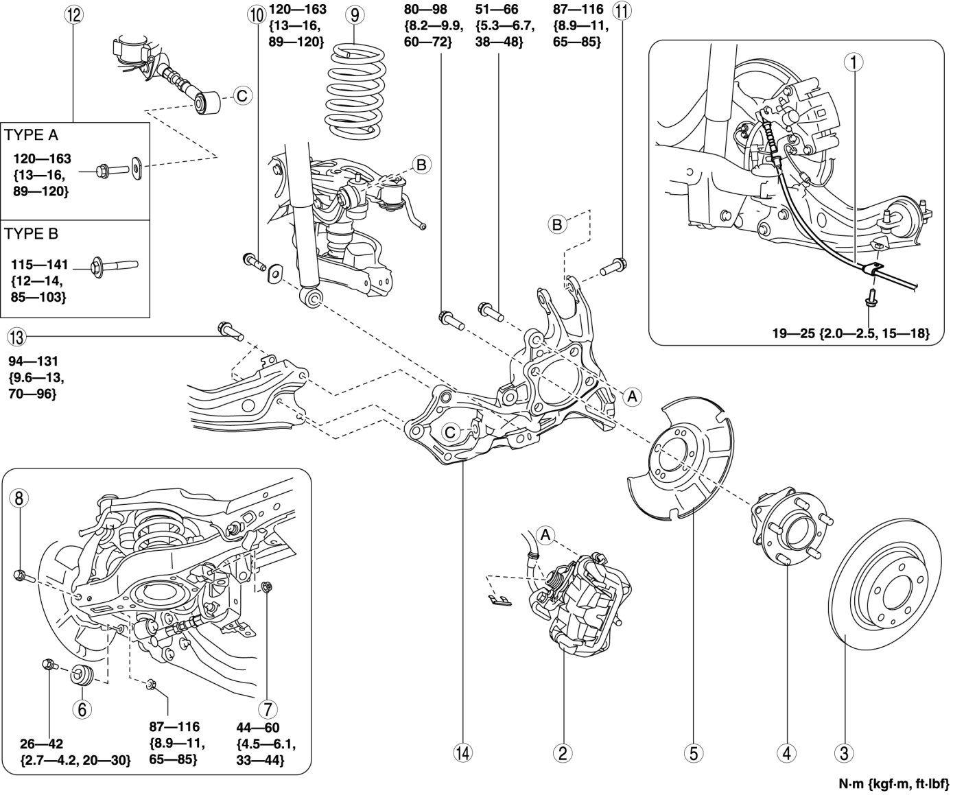 - Performing the following procedures without first removing the ABS wheel-speed sensor may possibly cause an open circuit in the wiring harness if it is pulled by mistake. Before performing the following procedures, disconnect the ABS wheel-speed sensor connector (body side) and fix the wiring harness to an appropriate place where it will not be pulled by mistake while servicing the vehicle.