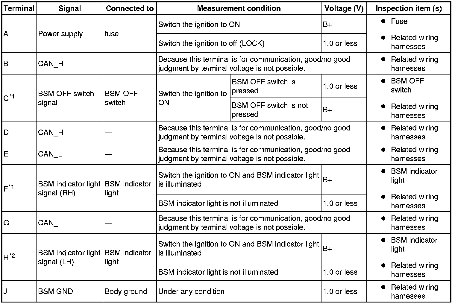 - The BSM control module connector cannot be connected to a tester due to its water-resistance processing, therefore the rear wiring harness connector is used for measuring the terminal voltage.