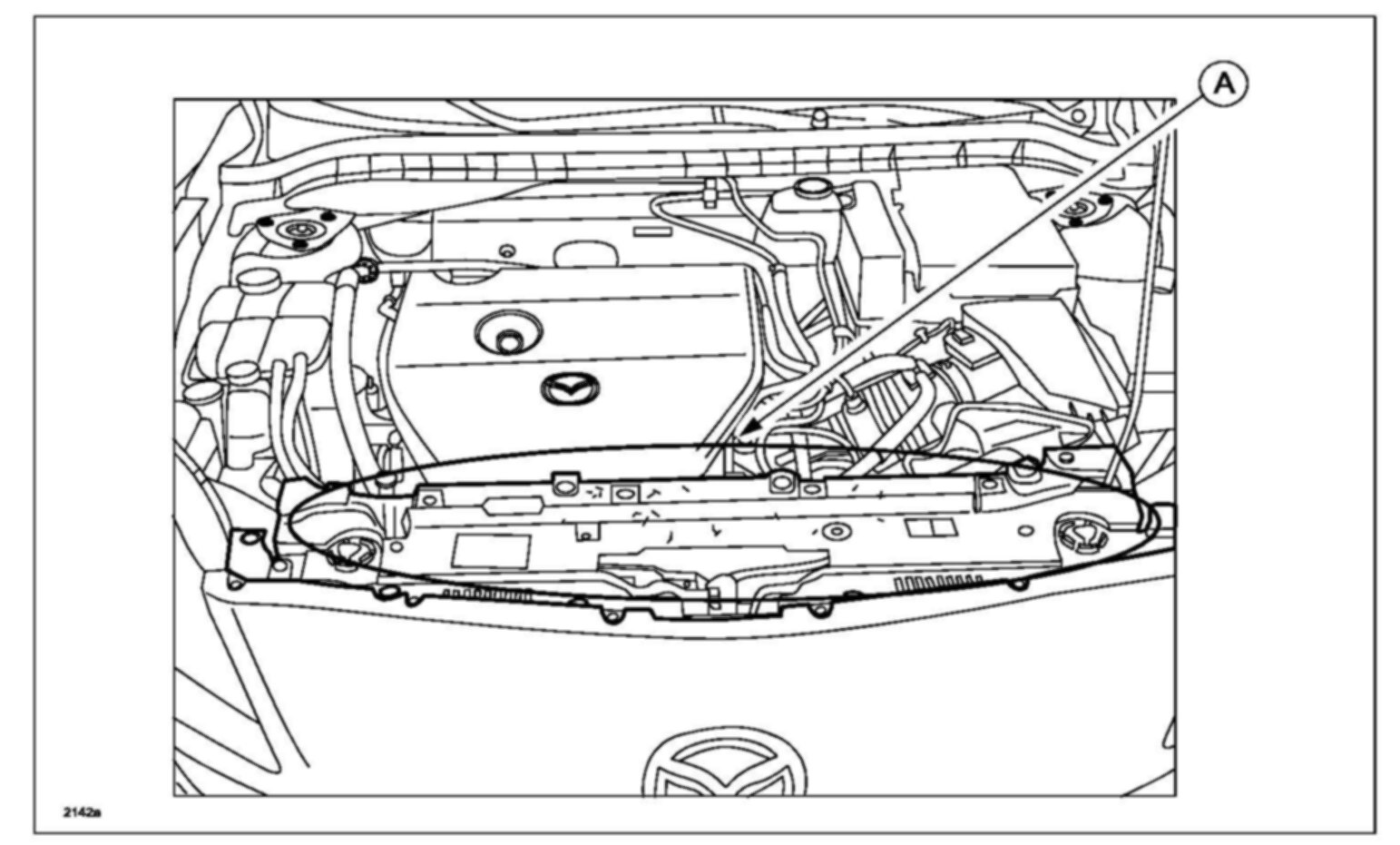 Some customers may complain of a poor appearance or white marks (A) on the surface of the plastic shroud panel when the hood is open. Please explain to the customer that the appearance is normal and does not require repair. The glass fiber contained in the plastic sometimes looks like white marks on the shroud panel surface. This is normal and does not affect vehicle performance.