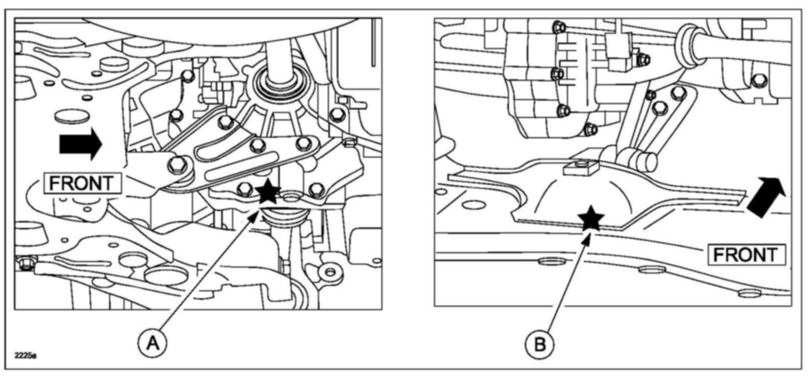 Body Side: Around mounting rubber fixing point on crossmember (B).