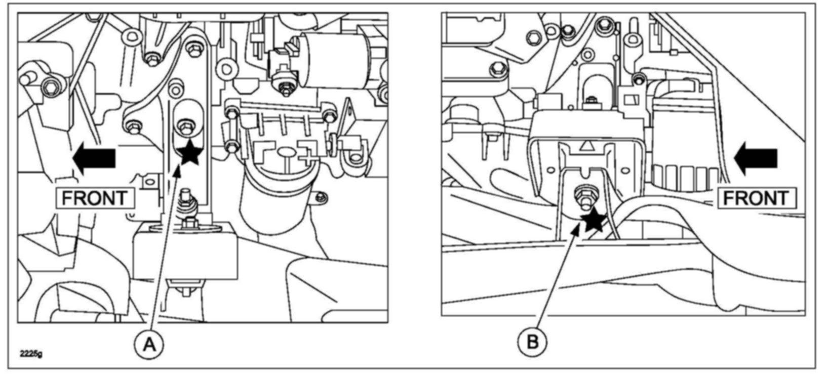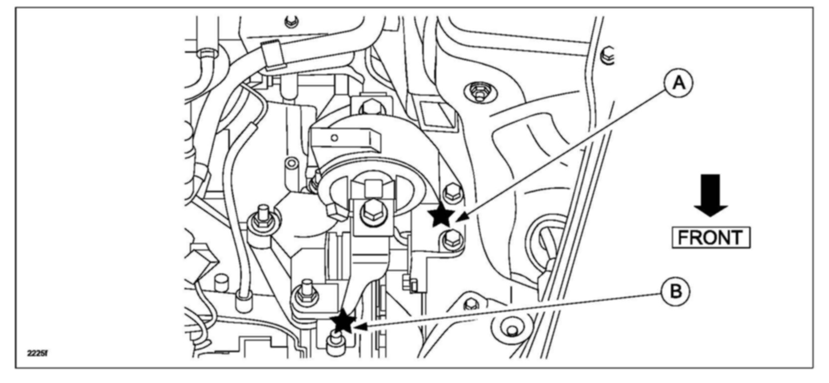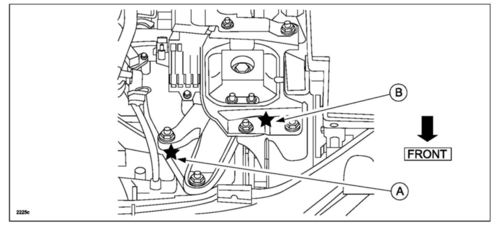 Engine Side: Around transmission case mount bracket fixing point (engine side) (A).