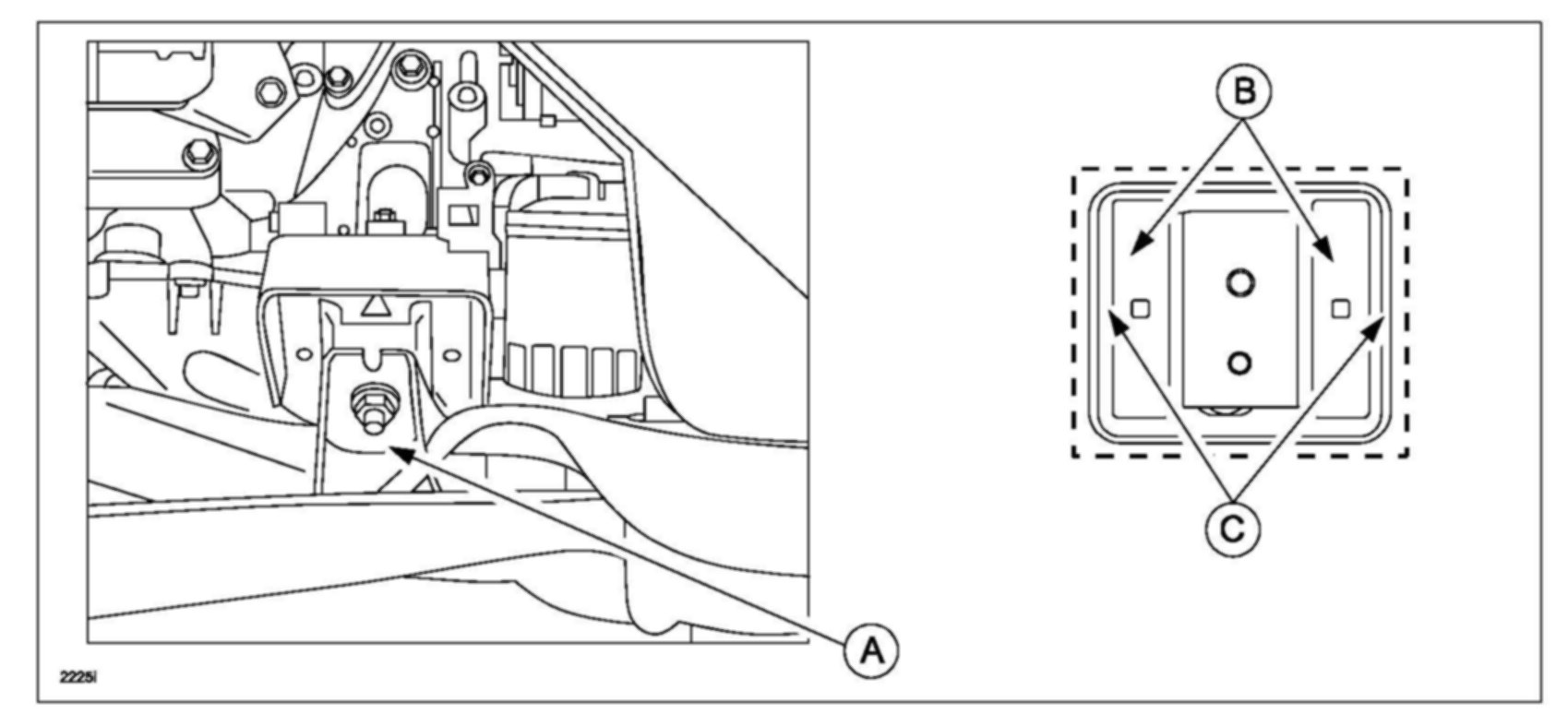 Check the engine mount (A) installed on both sides of the vehicle and verify that the shape of engine mount rubber (B) is symmetrical and not touching its housing (C).