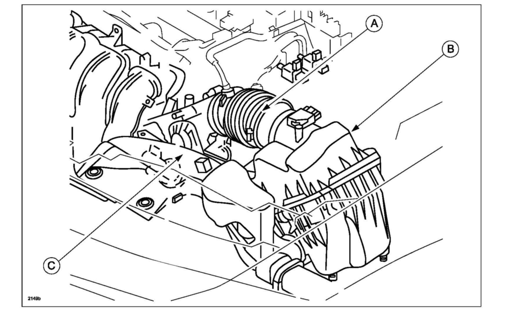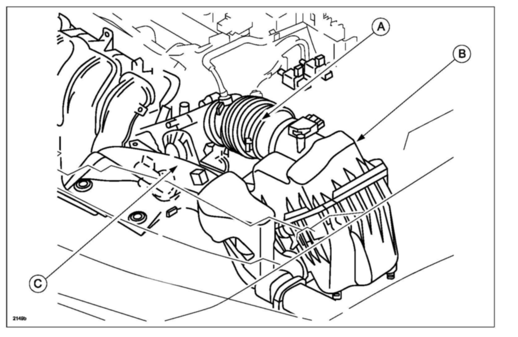 5. Remove air cleaner assembly (B), fresh air duct (C) and air hose (A).