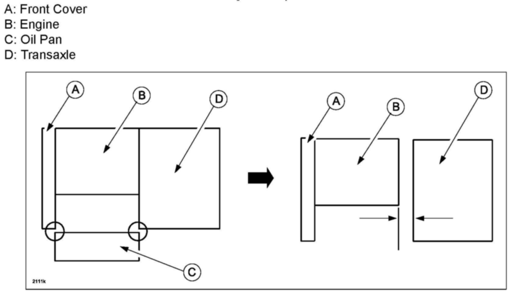 The thickness of silicone sealant tends to be thin because the clearance between the oil pan and the transmission and the front cover and transmission is almost zero during oil pan reinstallation. Allow 3mm space maximum between the engine and transmission with the transaxle bolts loosened one full turn before reinstalling the oil pan.
