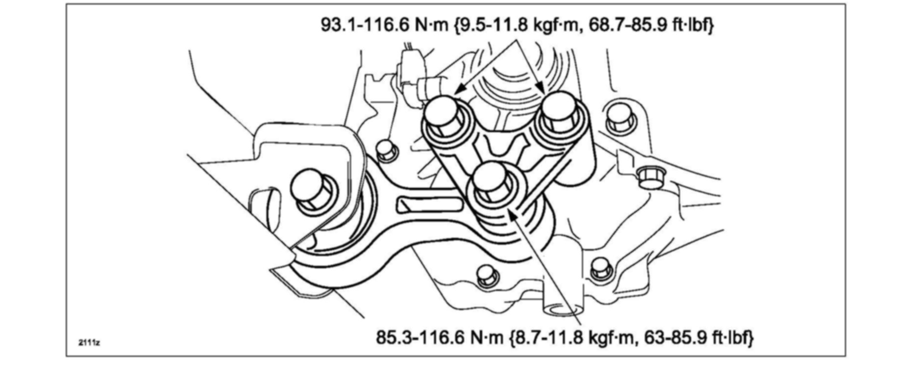 Upper Bolts: Tightening Torque: 93.1 - 116.6 N.m (9.5-11.8 kgf-m, 68.7-85.9 ft-lbf)