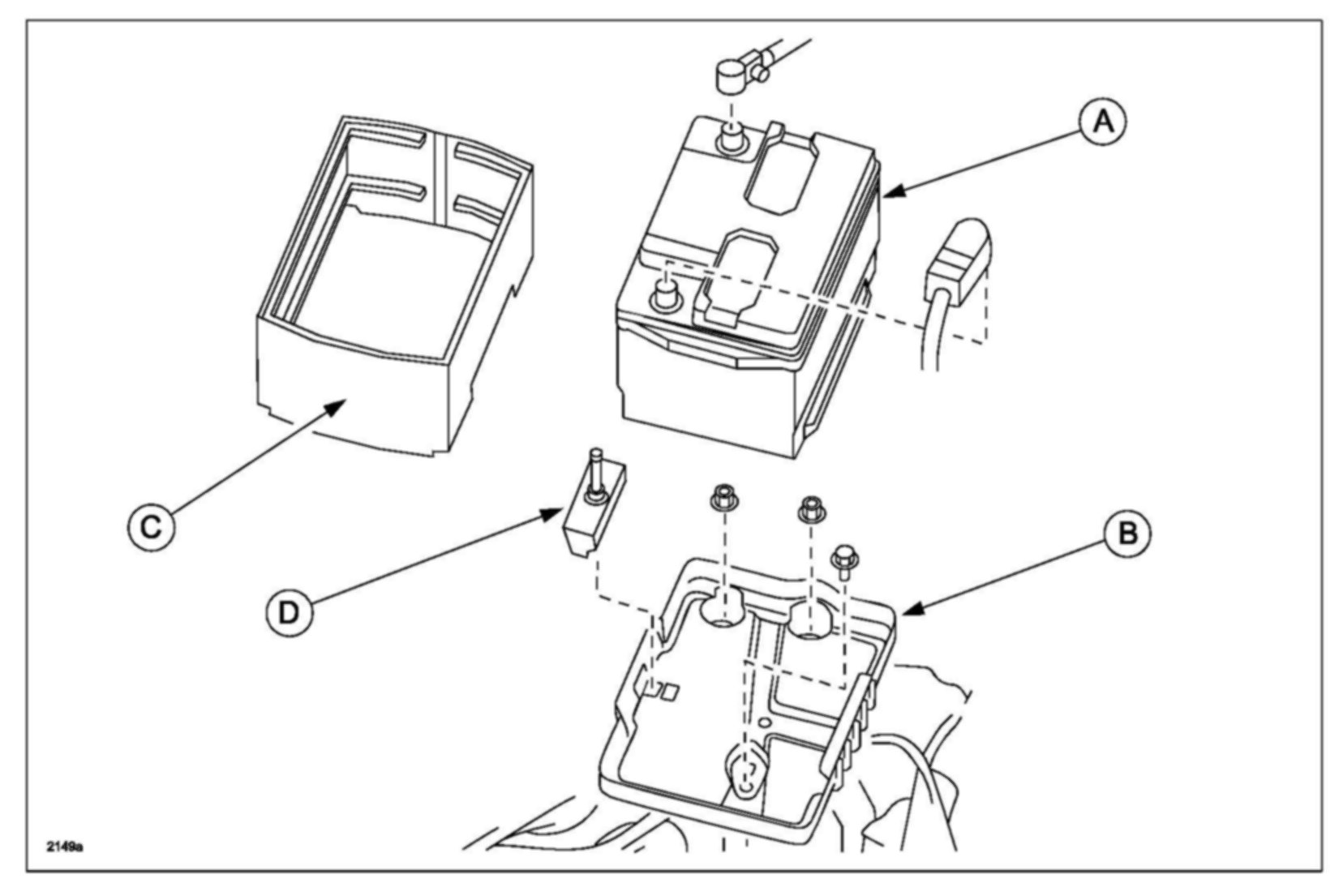 4. Remove battery clamp (D), battery box (C), battery (A) and battery tray (B).