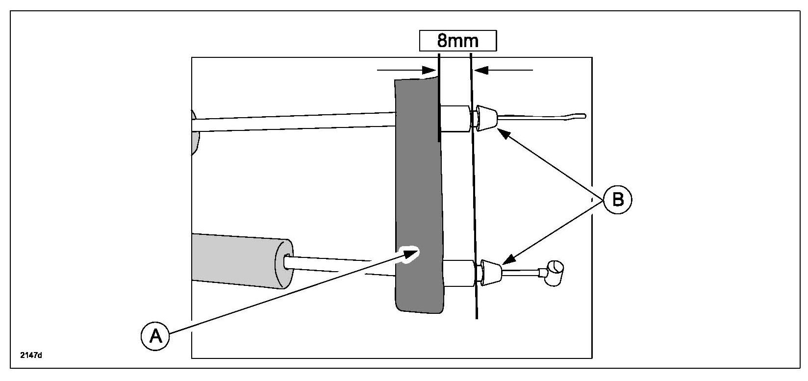 Install the pad 8mm from the caps (B) on the end of cable.