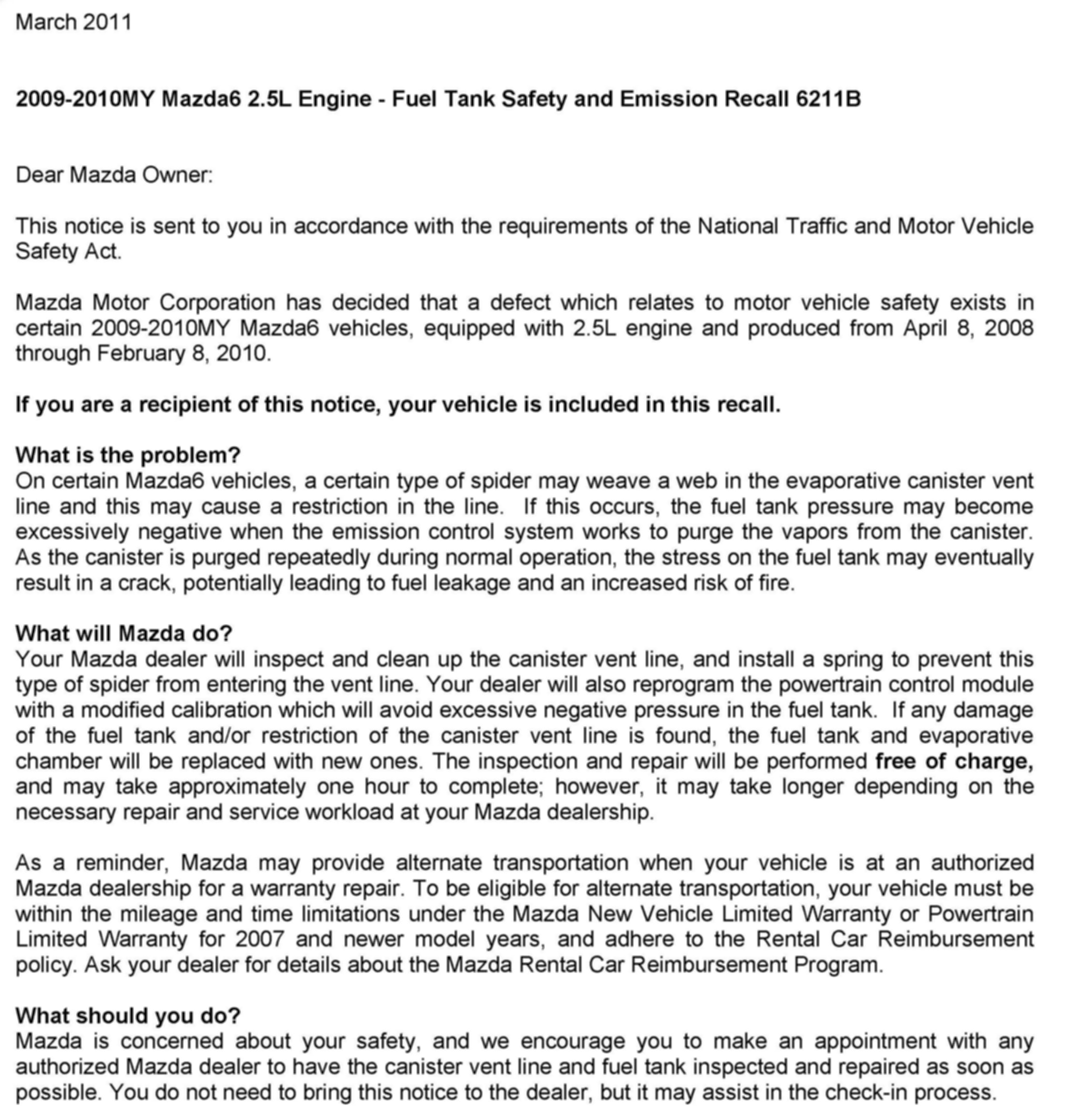 Recall - Spider Webs In EVAP Canister Vent Line