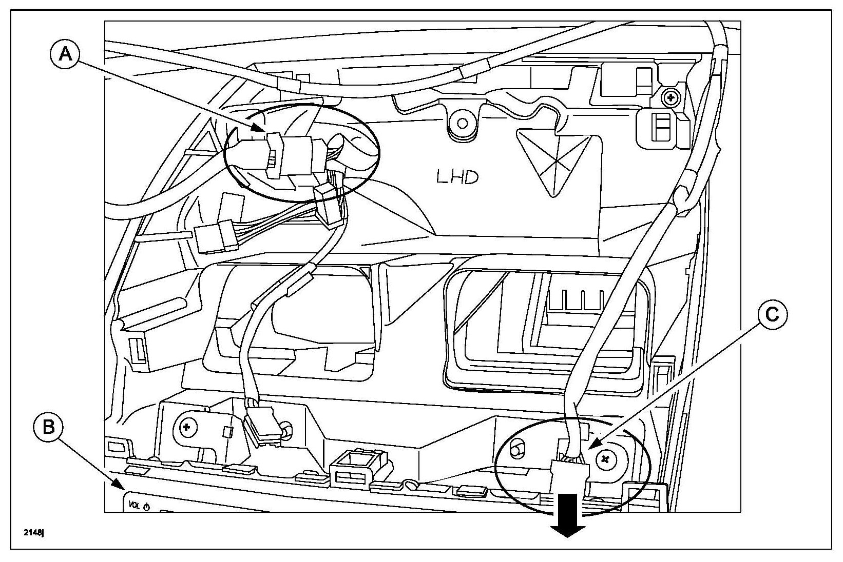 a. Disconnect microphone connector (A) from harness, then connect short cord to harness. Route short cord between audio (B) and instrumental panel through opening (C).