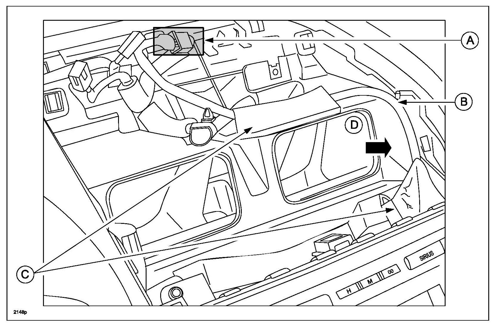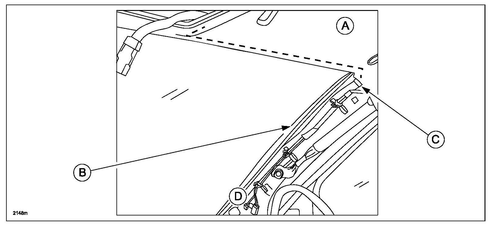 d. Route short cord (B) from A-pillar (D) to headliner (A).