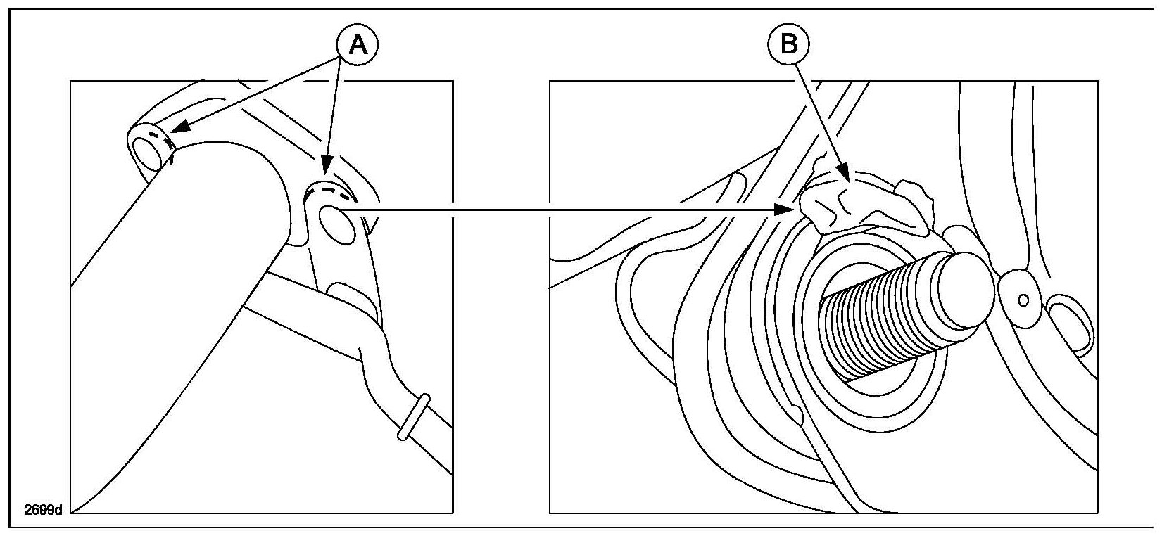 c. Remove any weld or weld splatter from the nut tightening surface of the hanger bracket (B). Also, remove the remaining weld from the flange that was attached to the bracket and make it a smooth surface.