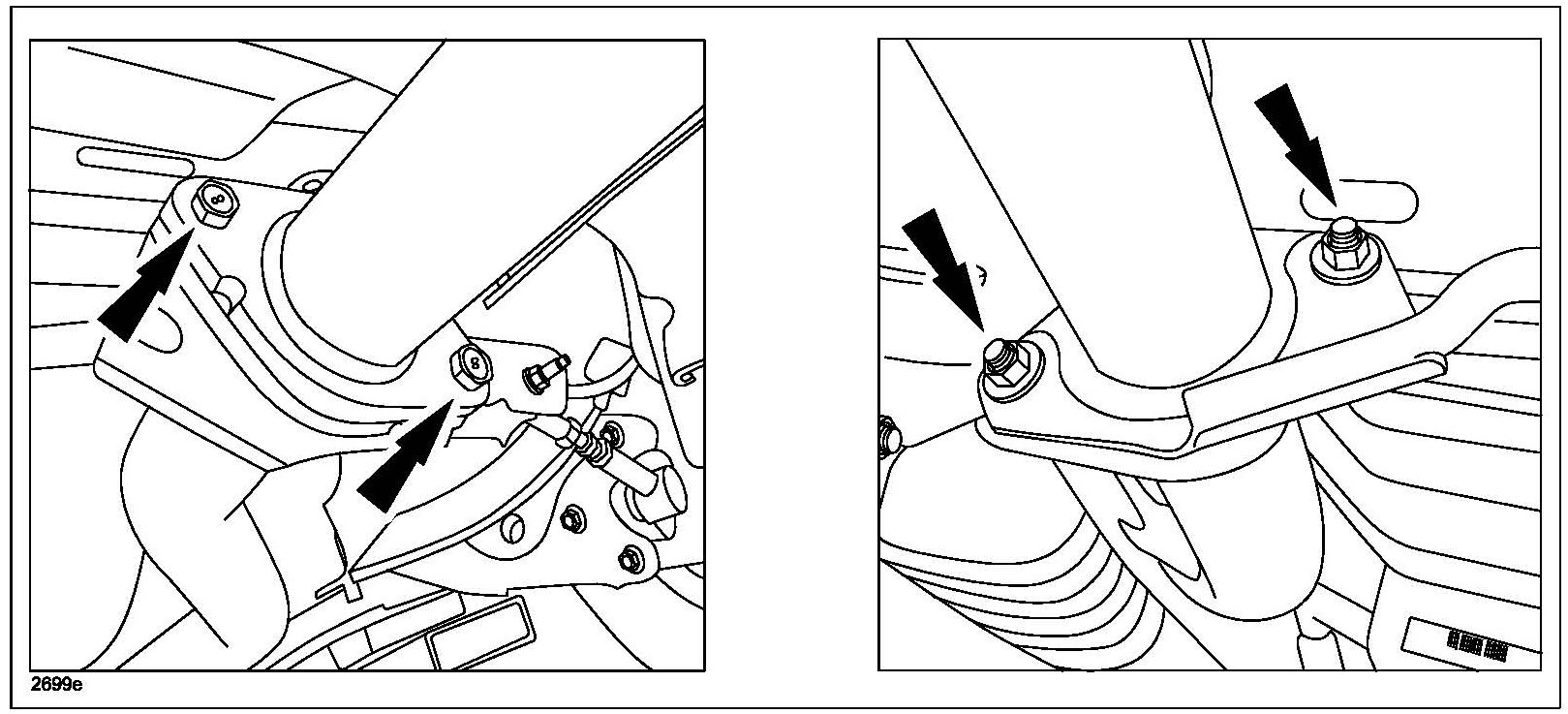 d. Insert new bolts from the main silencer side and hand start the nuts to the bolts from the pre-silencer separated hanger bracket side as shown below.
