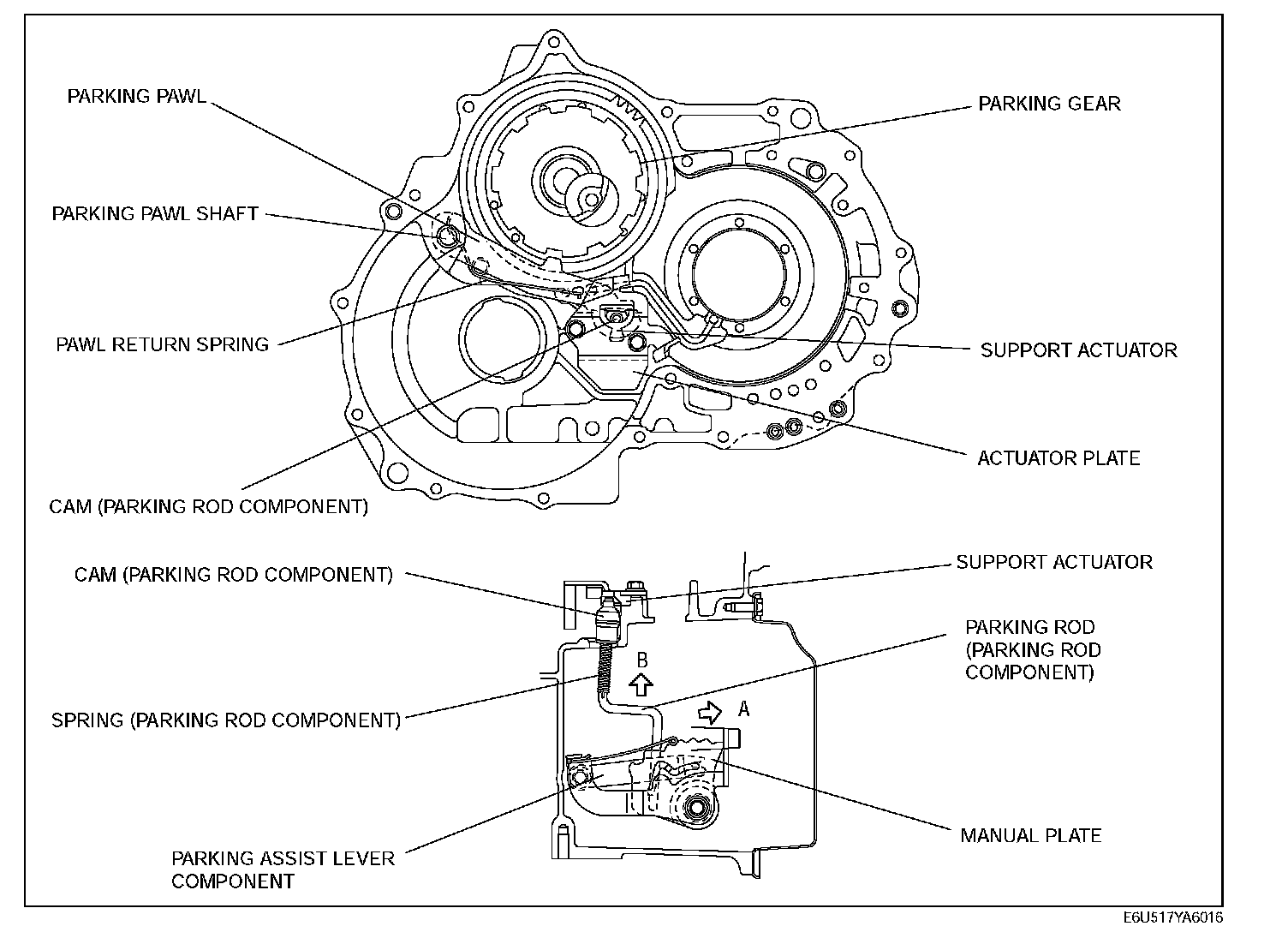 PARKING MECHANISM OPERATION^ When the selector lever is moved to P position, the manual shaft and the manual plate move in the direction of the arrow A to the position as shown in the figure below. Then the parking rod component moves in the direction of the arrow B, the parking rod component cam pushes up the parking pawl, and the parking pawl engages the parking gear. If the parking pawl hits the tooth of the parking gear, the parking pawl cannot be pushed up, so only the parking rod component is able to move. The cam presses the spring onto the parking pawl and the actuator. If the vehicle runs even a little under this condition, the wheels rotate and parking gear also rotates slightly. As a result, the parking pawl slides into the groove, and engages the parking gear. Thus, the parking mechanism prevents the vehicle from moving in P position.